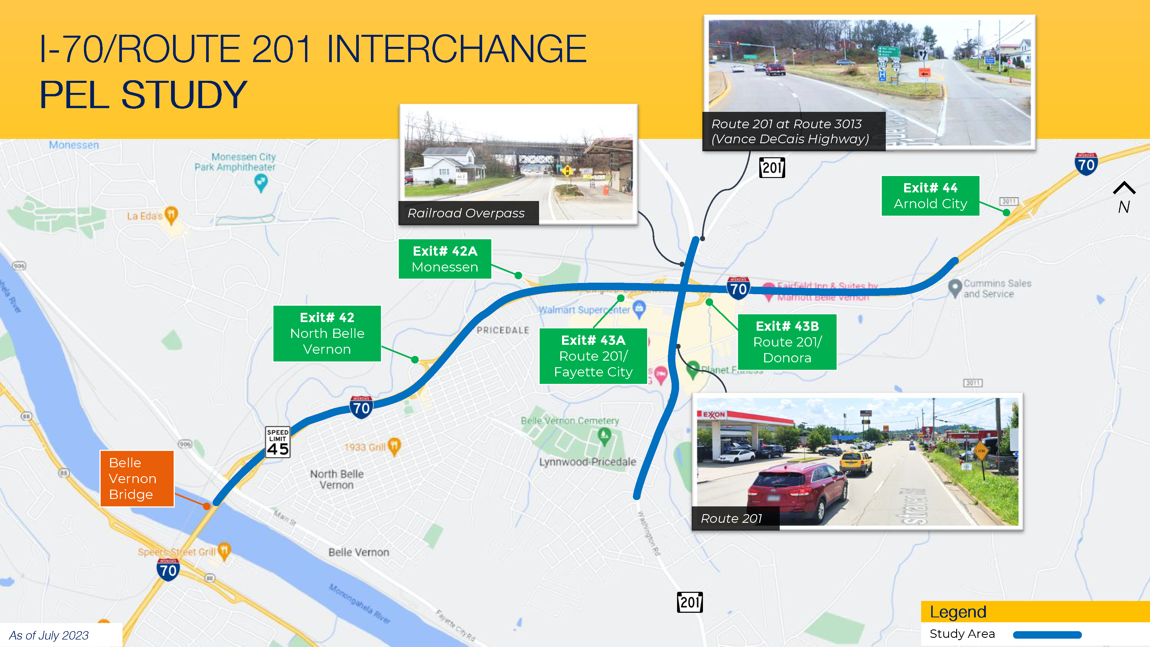 In June 2025, PennDOT District 12 began a PEL (Planning and Environment Linkages) study to improve the I-70/Route 201 Interchange area. The study is expected to last until late 2026. The study area will include the interchange, 1.17 miles of Route 201 between the intersection of Route 201 and Route 3013 (Vance DeCais Highway) to the Washington/Westmoreland county line, and 5.6 miles of I-70 in North Belle Vernon and Rostraver Township, Westmoreland County.