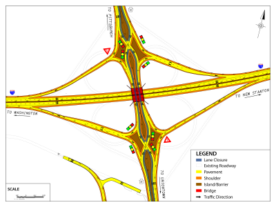Traffic will be introduced to the Diverging Diamond Interchange (DDI) configuration in a single-lane in each direction. Traffic on Route 51 will be placed onto the outside lanes and controlled by temporary traffic signals. Traffic on Route 51 will be placed in the following configuration: