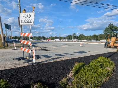 The relocated Finley Road cul-de-sac is nearly complete in August 2025